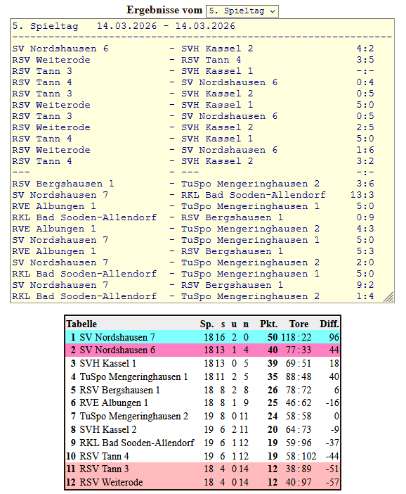 Am 14.03. fand der 5. Spieltag der Bezirksliga Nord statt. RSV Tann III (Möller/Holzhauer) konnte jedoch kurzfristig nicht antreten, weshalb alle angesetzten Spiele kampflos mit 0:5 gegen Tann gewertet wurden. Im Kampf um den Klassenerhalt gingen der Mannschaft dadurch wichtige Punkte verloren.
