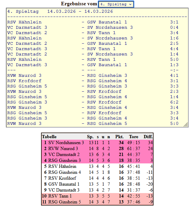 Mit Blick auf die aktuelle Tabelle steht der RSV Tann I derzeit mit 14 Punkten auf dem 10. Tabellenplatz. Allerdings zeigt sich das Mittelfeld der Oberliga Hessen äußerst eng beieinander. Zwischen Rang fünf und Rang zehn liegen lediglich zwei Punkte Unterschied. Mannschaften wie Hähnlein, Ginsheim IV, Baunatal I oder Krofdorf haben aktuell jeweils 16 Punkte auf dem Konto. Damit befindet sich der RSV Tann I trotz der aktuellen Platzierung weiterhin in Schlagdistanz zum Mittelfeld.