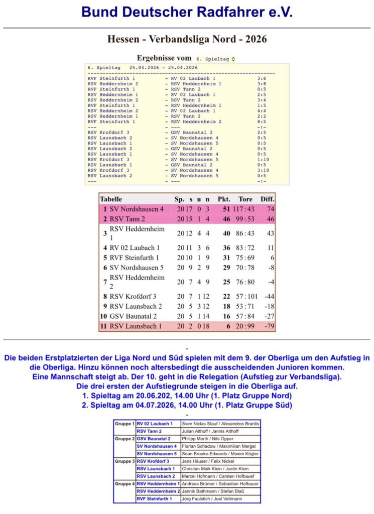 Der 6. und damit letzte Spieltag der Oberliga (RSV Tann I – Weber/Schmitt) findet am 09.05.2026 ab 14:00 Uhr in der Frankfurter Straße 37, 65462 Ginsheim-Gustavsburg (Neue Turnhalle) statt.